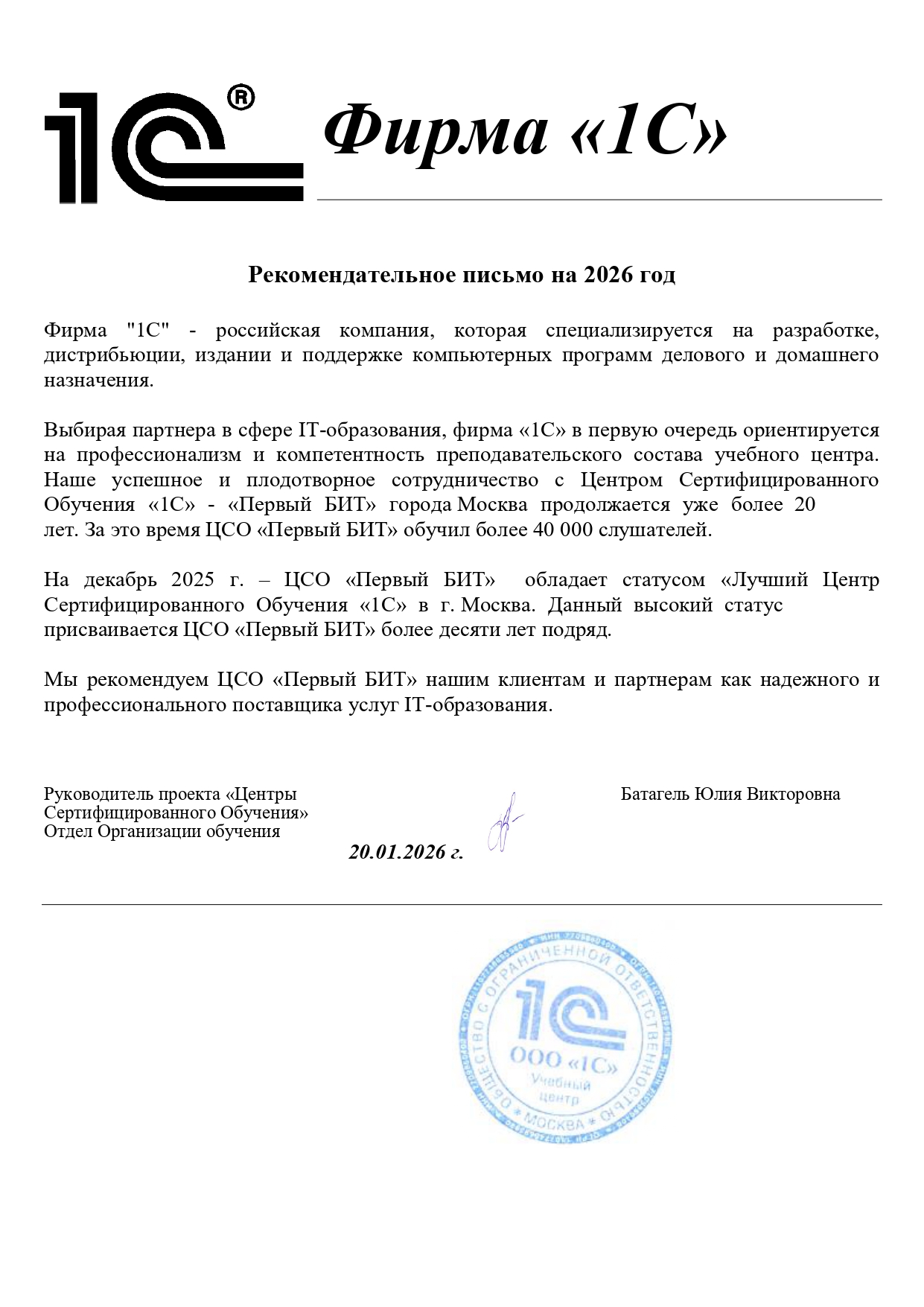 Рекомендательное письмо от фирмы «1С» об обладании учебного центра статусом «Лучший центр сертифицированного обучения 1С» в городе Санкт-Петербург. Данное рекомендательное письмо свидетельствует о том, что фирма 1С рекомендует клиентам и партнерам наш учебный центр как надежного и профессионального поставщика услуг IT-образования.